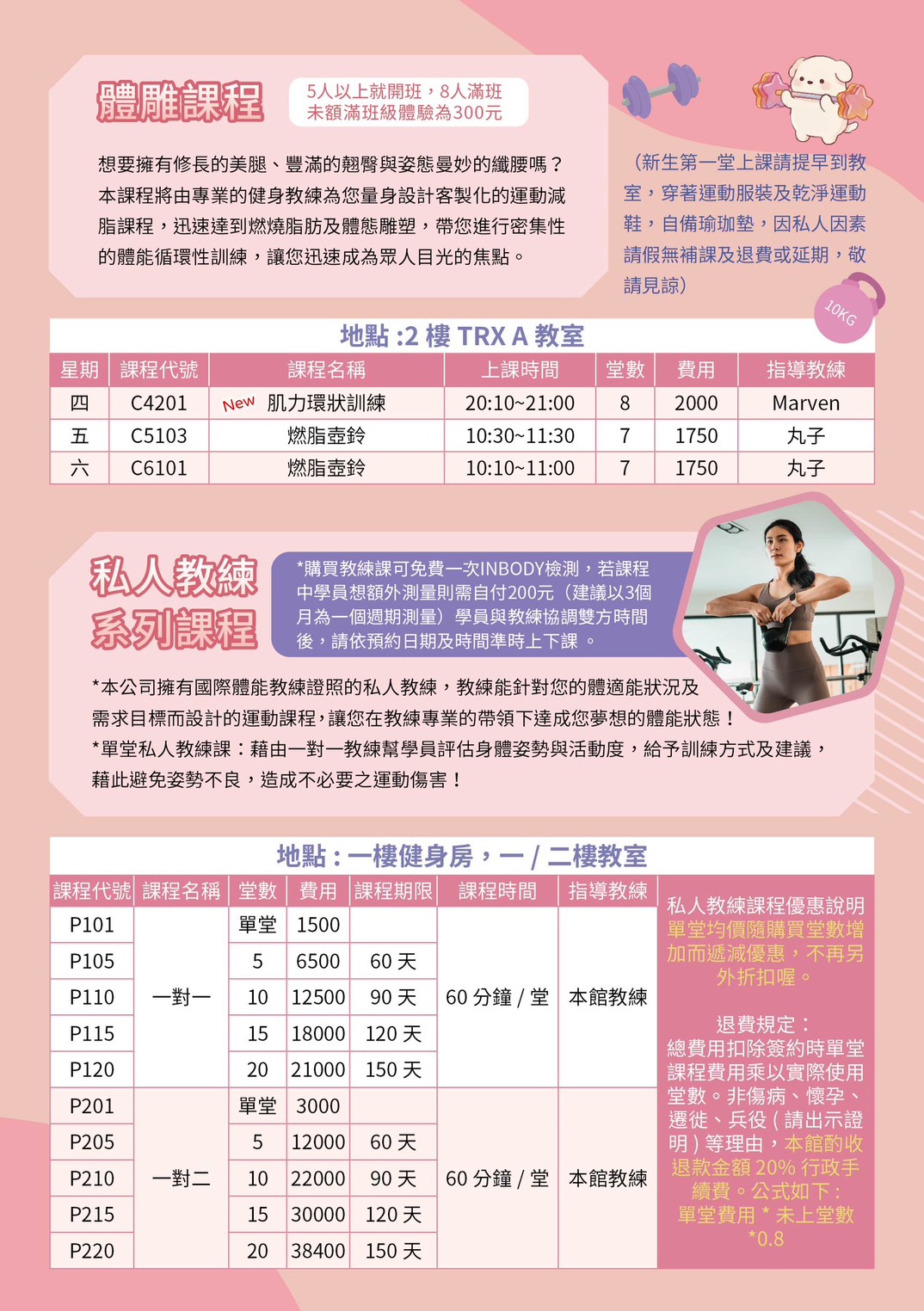 體雕、PT課程 台中港區運動公園 課程資訊11503期課程2019-09-05有氧及舞蹈課程2019-02-25瑜珈課程2019-02-25TRX課程2019-02-25飛輪課程2019-02-25球類課程2019-02-25運動課程報名需知2019-02-25
